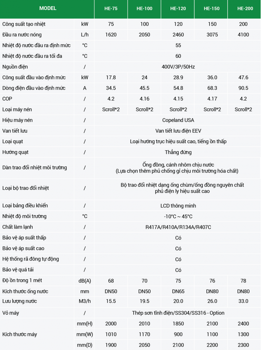 | Công suất tạo nhiệt | 75 kW | 100 kW | 120 kW | 150 kW | 200 kW |