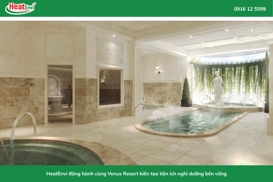 Là đơn vị tiên phong trong lĩnh vực năng lượng tái tạo tại Việt Nam, HeatEnvi đảm nhận vai trò cung cấp và lắp đặt hệ thống bơm nhiệt cho Venus Resort. Giải pháp này đáp ứng toàn diện nhu cầu nước nóng cho khu lưu trú, nhà hàng và khu trị liệu khoáng - onsen của dự án.